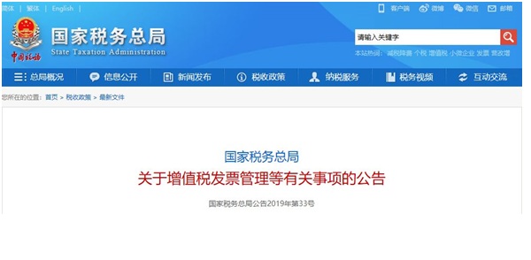 國家稅務(wù)總局關(guān)于增值稅發(fā)票管理等有關(guān)事項的公告國家稅務(wù)總局公告 2019年第33號